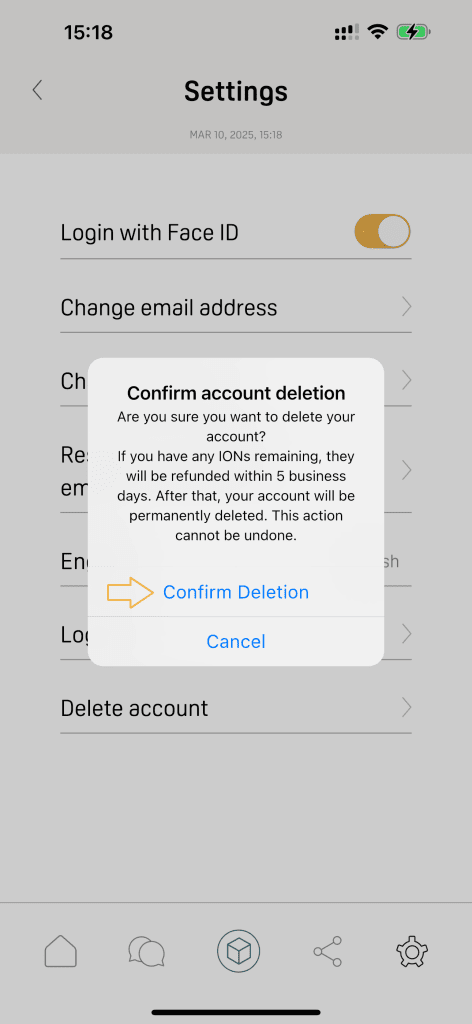 Delete account In the ION app > Navigate to General Navigate to Settings Click Delete account Click Confirm deletion